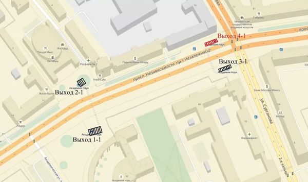 На «Академии наук» будет перекрыт также выход № 4-1 (на пересечении с улицей Сурганова к Академии искусств).