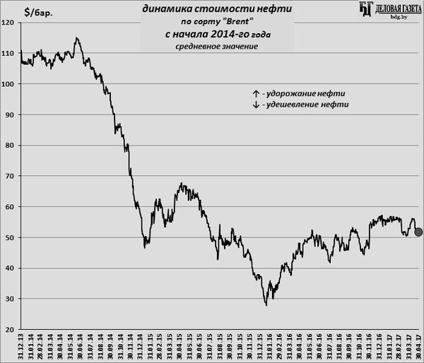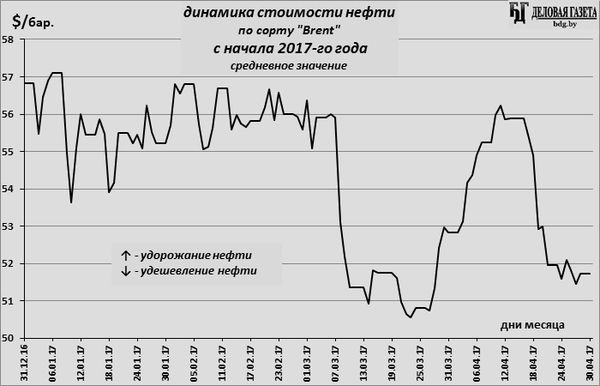 Нефтяные цены первую половину апреля восстанавливались после мартовского падения, поднявшись обратно к уровню 55-56 $/бар. (по сорту «Brent»), на котором они держались с декабря 2016-го, но затем снова упали. Итоговое изменение за отчетный месяц - удешевление нефти на 2,1%: в конце марта было 52,8 $/бар., в конце апреля - 51,7 S/бар.