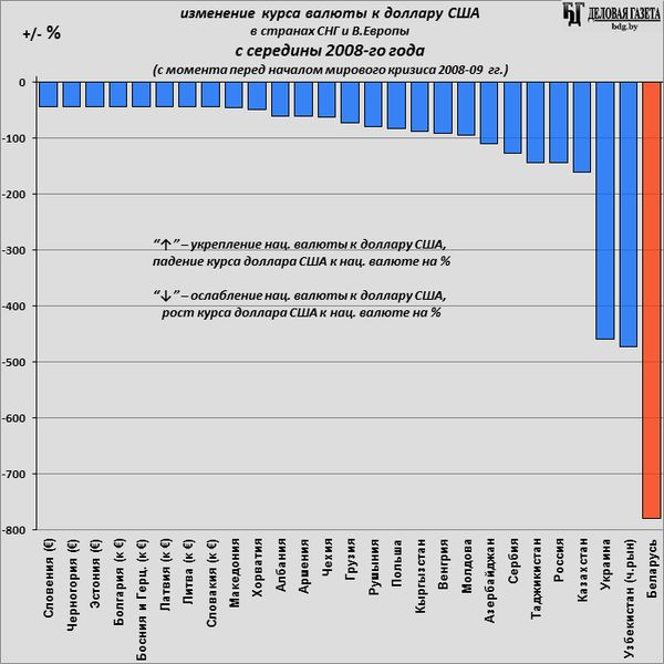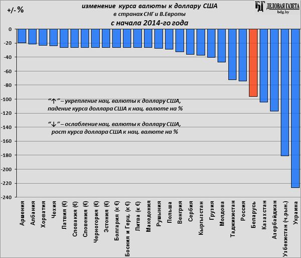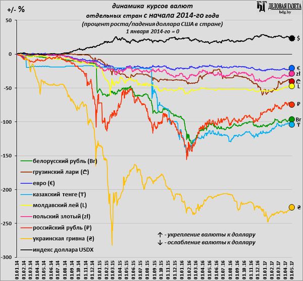 Из-за падения цен на нефть за этот период более чем в 2 раза (со 110 $/бар. в начале 2014-го до менее 52 $/бар. в конце апреля 2017-го по сорту «Brent») ослабли валюты стран, зависящих от экспорта нефти: манат Азербайджана (в 2,17 раз), ₸-тенге Казахстана (в 2,04 раз), и ₽-рубль России (на 75%). Br-рубль Беларуси, которая зависит от экспорта нефтепродуктов из российской нефти, да и в целом от России, стал слабей за это время почти в 2 раза (доллар в Беларуси вырос на 96,3%).