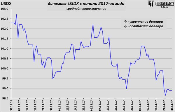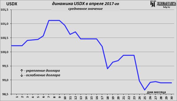Индекс USDX, показывающий отношение доллара США к корзине из 6 мировых валют (евро, японской иене, канадскому доллару, фунту стерлингов, шведской кроне, швейцарскому франку), начал апрель с 100,22 пунктов, а закончил на 98,90 (по среднедневному значению). Итоговое ослабление доллара по USDX за месяц – 1,32%.