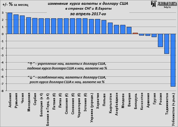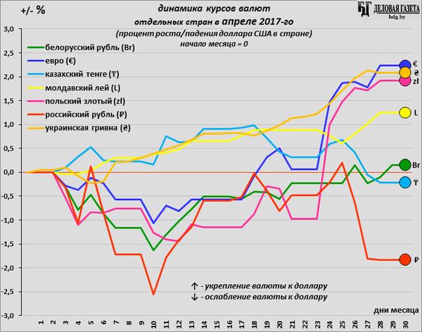 Из валют близких к Беларуси стран ослабли к доллару только российский рубль и казахский тенге: результат падения цен на нефть. Но белорусский рубль от них ушел недалеко: его укрепление за апрель было самым незначительным. (Прогноз курса белорусского рубля на 2017 год, а также информация о финансах Беларуси предоставлена на сайте Банки.Бел).
