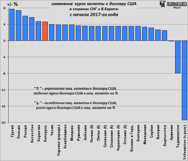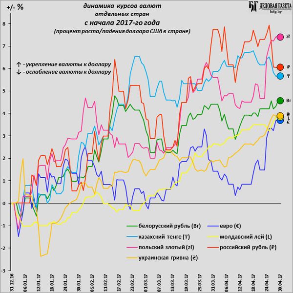 На выросшей в конце 2016-го нефти поднялись нефтяные валюты: казахский тенге и российский рубль, а также союзная с ними валюта еще одного нефтяного экспортера (нефтепродуктов) – белорусский рубль. Но и валюты остальных близких к Беларуси стран укрепились к доллару за первые 4 месяца 2017-го: сказалось вышеуказанное ослабление самого доллара (по USDX).