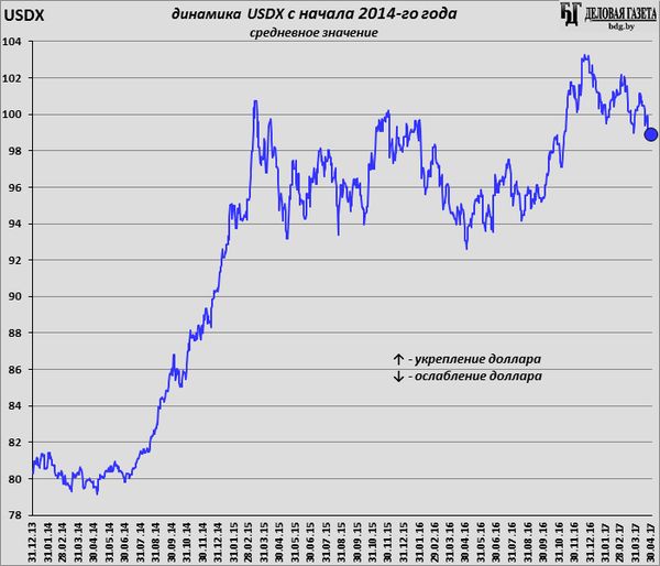 За 4 месяца 2017-го, глобальная стоимость доллара упала на 3,31%: индекс USDX закончил 2016-й год на 102,29 пунктах, а в конце апреля 2017-го составил 98,90 пунктов. Динамику же индекса в течение этих 4-х месяцев можно назвать как «шаг вверх, два шага вниз»: колебания довольно высокоамплитудные, но с каждым разом – все ниже.