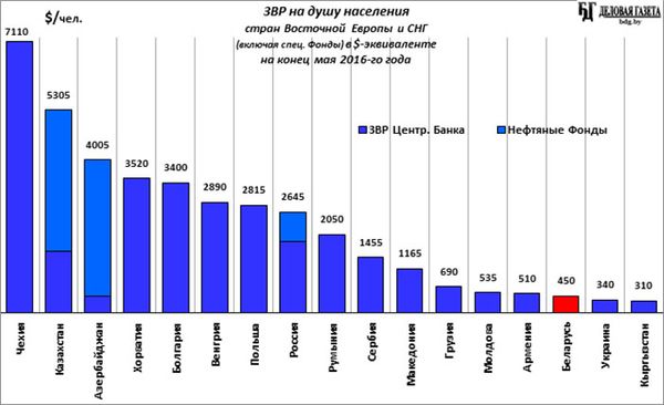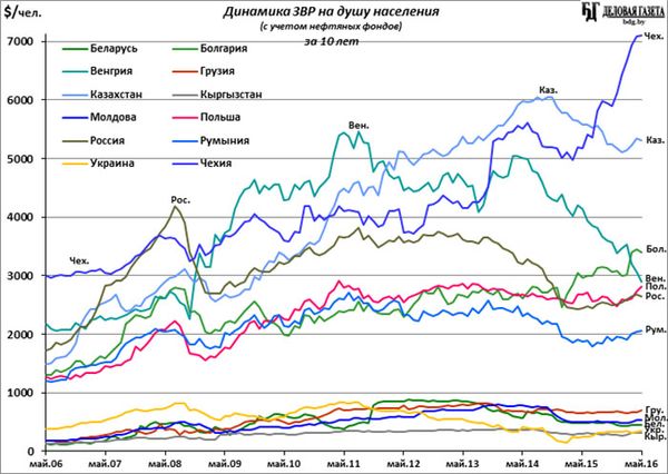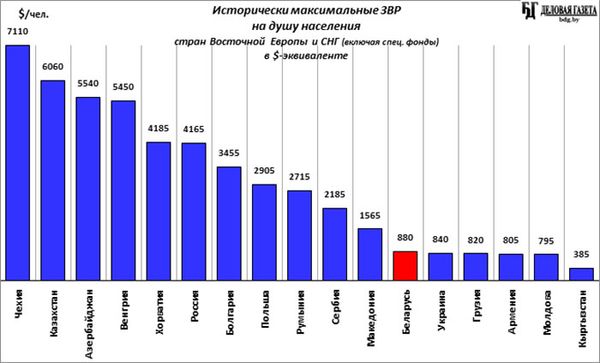 Рекордные за все время ЗВР, из расчета на численность населения, среди всех стран СНГ и Восточной Европы еще недавно было у Казахстана. Но, начиная с декабря 2015-го, лидером здесь стала Чехия, а сейчас «отрыв» Чехии только увеличился, достигнув более $1000 от 2-го места (Казахстана).