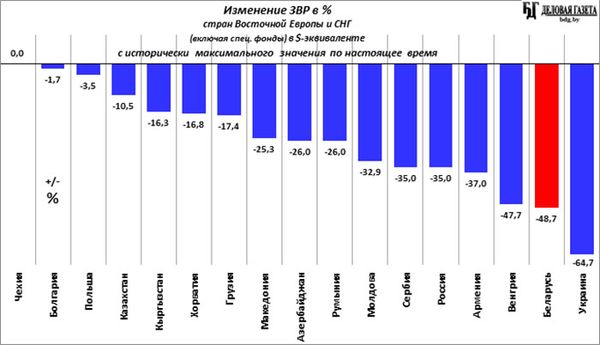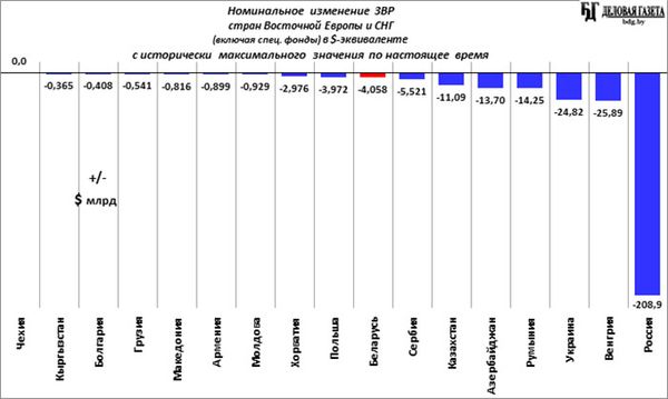 В абсолютном выражении сегодняшние ЗВР Беларуси меньше рекордных на $4,058 млрд: это потери за 47 месяцев. У России сейчас ЗВР меньше их исторически максимального значения на $209 млрд. Из стран ЕС больше других потеряла Венгрия - почти $26 млрд, что очень много для этой небольшой страны (население - 9,5 млн чел.).