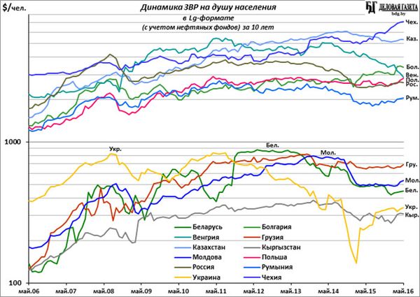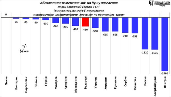 Максимум ЗВР Беларуси - 880 $/чел.- это был 12-й результат из 17-ти (когда как сейчас - лишь 15-е место среди тех же 17-ти). За время с середины 2012-го, когда в Беларуси и был зафиксирован максимум ЗВР, по подушевому размеру ЗВР были пропущены вперед Грузия, Армения и Молдова. И лишь Украина и Кыргызстан (и Таджикистан) по этому показателю остались хуже Беларуси.