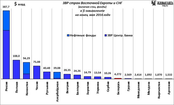 По своей абсолютной величине самыми большими, из данного списка стран, валютными запасами обладает Россия - благодаря своим размерам и огромным запасам нефтегазового и другого сырья. На 2-ом месте - Польша с крупнейшей экономикой Восточной Европы. Раньше у нее были 3-и ЗВР, в то время как 2-е место по размерам валютных резервов какое-то время удерживал Казахстан, но с апреля 2015-го его совокупные (с Национальным Фондом) резервы упали из-за сокращения притока «нефтедолларов».