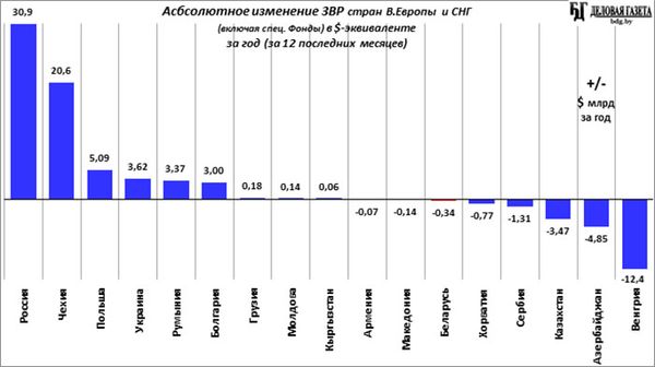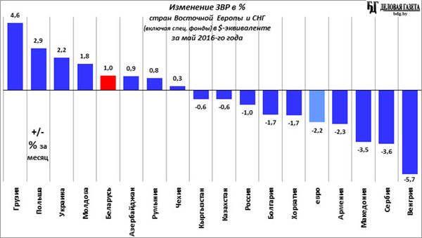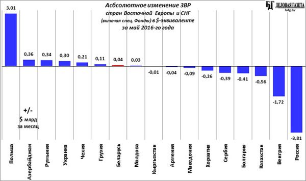 Самое сильное, в абсолютном выражении, изменение ЗВР (в долларовом эквиваленте) произошло в мае в крупнейших странах: наибольший прирост - в Польше (несмотря на ослабление евро в этом месяце), а наибольшее падение - в России (несмотря на рост цен на нефть). В «плюсовом» ряду - и ЗВР Беларуси, но рост, как и в предыдущие месяцы, незначительный.