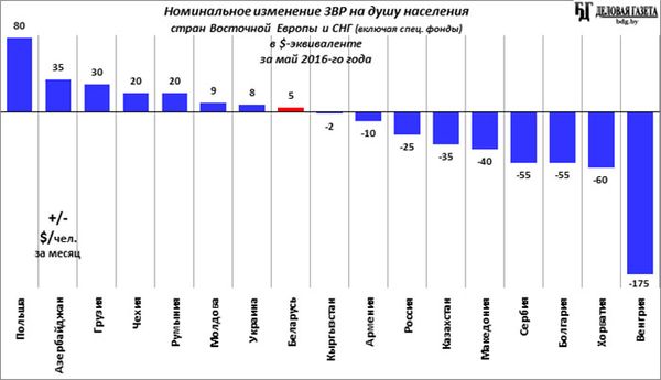 Показатель ЗВР на душу населения в мае больше других вырос у Чехии, Азербайджана и Грузии. Снова больше, чем где-либо, снизился подушевой размер ЗВР в Венгрии. В Беларуси ЗВР выросли слабо: прибавка - лишь по $5 на каждого гражданина страны.