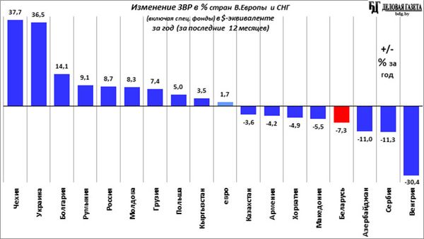 Евро за 12 месяцев укрепился к доллару на 1,7%. Рост ЗВР в долларах более чем на 1,7% - это рост ЗВР и в евро, а рост $-эквивалента ЗВР менее чем на 1,7% или же их падение - это снижение €-эквиваленте ЗВР. В половине стран Восточной Европы €-эквивалент ЗВР вырос, в половине - сократился.