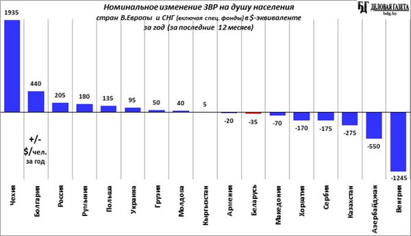 Беларусь находится в группе стран с малыми ЗВР, «соперничая» с небогатыми государствами б.СССР: подушевые ЗВР Беларуси на протяжении многих лет сравнимы с ЗВР Молдовы. До 2011-го показатель «ЗВР на душу населения» Беларуси был ниже украинского, но когда была продана Газпрому вторая половина Белтрансгаза - стал выше.