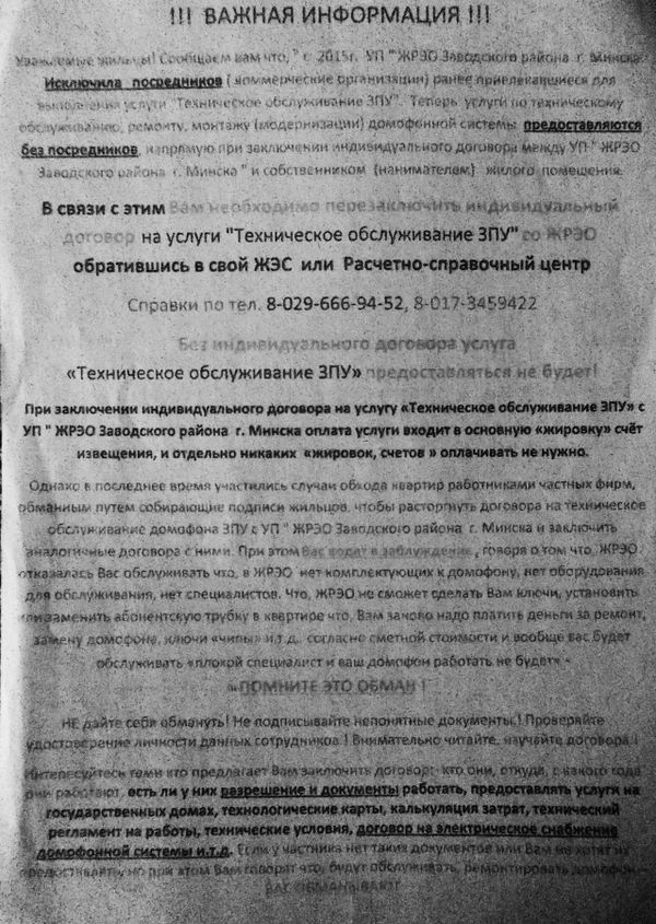 В частности, УП ЖРЭО Заводского района пишет: «Сообщаем вам, что с 2015 г. УП ЖРЭО Заводского района г. Минска исключила посредников (коммерческие организации) ранее привлекавшийся для выполнения услуги «Техническое обслуживание ЗПУ». Теперь услуги по техническому обслуживанию, ремонту, монтажу (модернизации) домофонной системы предоставляется без посредников, напрямую при заключении индивидуального договора между УП «ЖРЭО Заводского района г. Минска» и собственником (нанимателем) жилого помещения»*. Лихо непосредственного поставщика услуг переименовали в посредника!