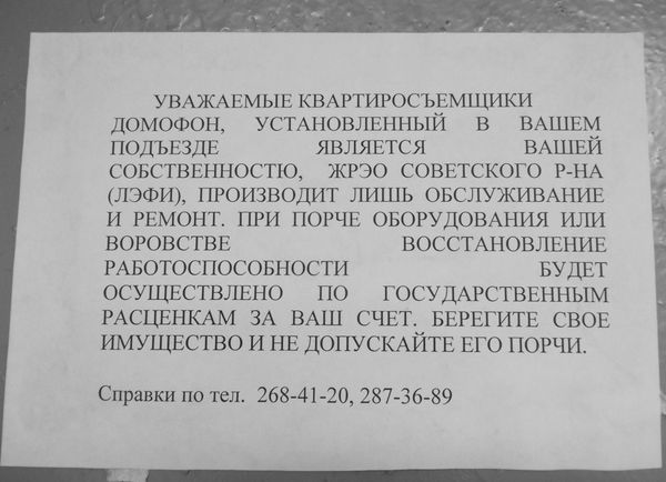 Тем не менее, с января нынешнего года жильцы подъезда получают жировку, по которой ЖРЭО взымает деньги за обслуживание домофонов и от коммерческой организации «Домофонсталь», с которой жильцы не расторгли индивидуальные договоры и которая по-прежнему обслуживает домофоны.