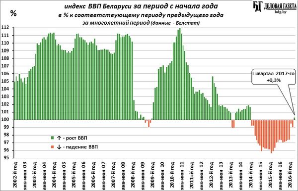 Белстат впервые с конца 2014-го обнародовал плюсовой индекс ВВП: в I квартале 2017-го страна создала на 0,3% больше, чем в I квартале 2016-го. До этого было 26 «минусов» в формате «за период с начала года».