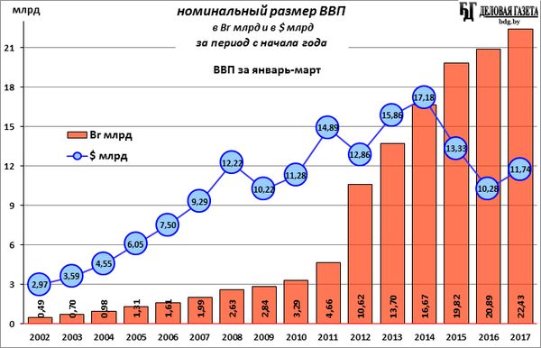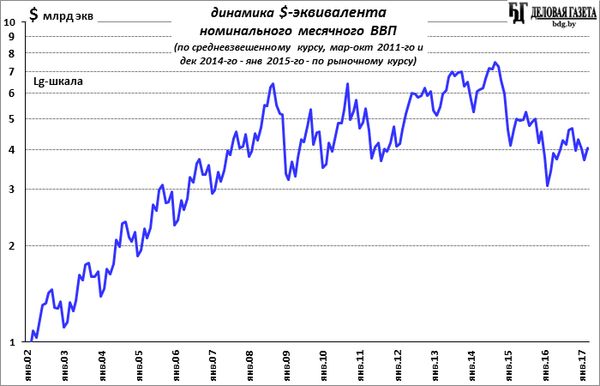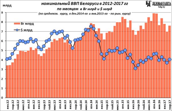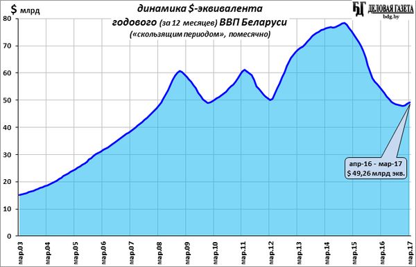 Годовой ВВП (суммарный последних 12-ти месяцев) в долларовом эквиваленте (сумма месячных $-эквивалентов ВВП по средневзвешенным месячным курсам Br/$ от Национального Банка) в отчетном периоде - $49,26 млрд. Рост показателя идет 3-й месяц подряд. За календарный 2016-й $-эквивалент составил $47,80 млрд – «дно» текущего кризиса.