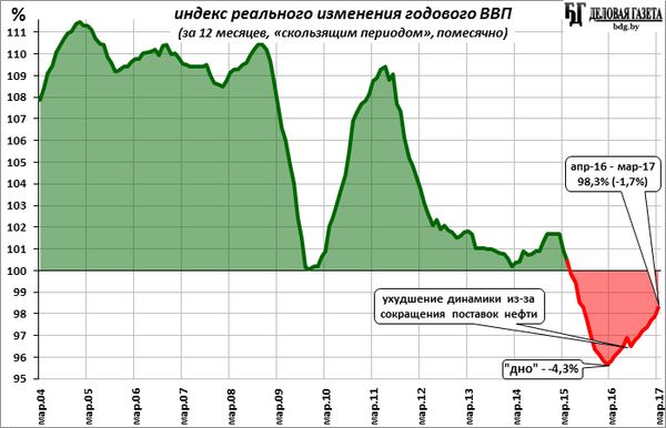 С сентября 2016-го, с более низкого уровня, «минус» пошел на уменьшение: индекс ВВП календарного 2016-го поднялся до 97,4% (-2,6%), а в отчетном 12-месячном периоде («апрель 2016-го – март 2017-го») составил уже 98,3% (--1,7%). Причем в отчетном периоде скорость улучшения показателя возросла.