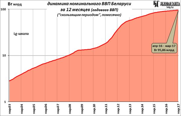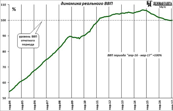 Объем годового ВВП, созданного за последние 12 месяцев (некалендарный год, с апреля 2016-го по март 2017-го) - Br95,86 млрд. По итогам календарного 2016-го года было Br94,32 млрд, 2015-го – Br89,91 млрд, 2014-го – Br80,58 млрд.