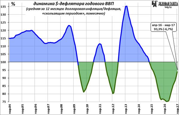 Долларовый эквивалент 12-месячного ВВП отчетного периода «апрель 2016-го - март 2017-го» меньше соответствующего периода год назад на 8,3 % (сейчас - $49,26 млрд, тогда - $53,70 млрд). При реальном падении экономики лишь на 1,7% более сильное падение $-эквивалента - это результат действия долларовой дефляции: $-дефлятор годового ВВП - -6,7%: долларовые цены и стоимости отчетного 12-месячного периода на 6,7% меньше, в целом, чем год назад.
