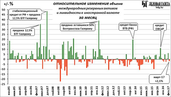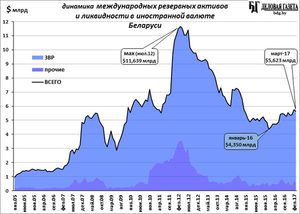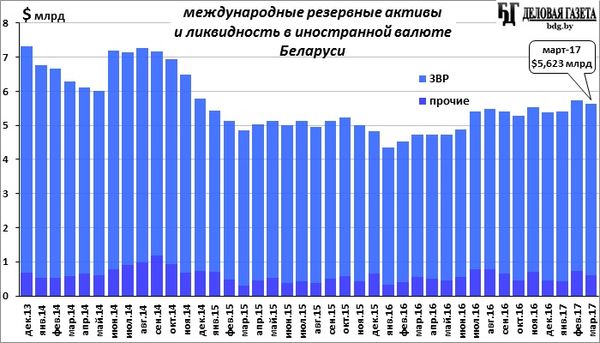На конец марта 2017-го года объем международных резервных активов и ликвидности в иностранной валюте Беларуси составил $5,623 млрд (в том числе официальных резервных активов – ЗВР - $5,016 млрд. других резервных активов в иностранной валюте, не включенных в резервные активы - $607 млн). За месяц они сократились на $120 млн (ЗВР упали незначительно, на $6 млн, но другие резервы снизились более существенно - на $114 млн).
