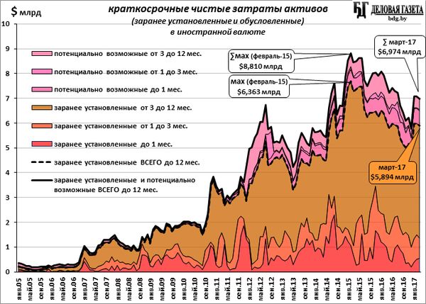 Заранее установленных, то есть уже расписанных, чистых затрат иностранной валюты (запланированных ее расходов за минусом запланированного притока) в течение следующих 12-ти месяцев предстоит на $5,894 млрд, в т.ч. в ближайшем месяце - $538 млн, от 1-го месяца до 3-х - $823 млн, и от 3-х до 12-ти месяцев - $4,533 млрд (по состоянию на конец марта 2017-го). Месяц назад было $5,743 млрд. То есть за март скользящая 12-месячная сумма уменьшилась на $86 млн.