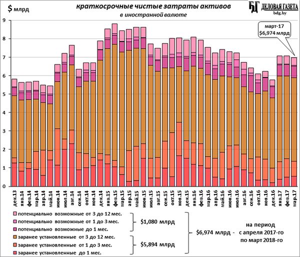 На конец марта сумма заранее установленных, уже запланированных и расписанных на ближайшие 12 месяцев, чистых затрат инвалютных активов (предстоящих в этом периоде расходований международных резервов и прочей инвалютной ликвидности на обслуживание внешнего и внутреннего инвалютного госдолга и по другим операциям, требующих затрат в иностранной валюте), составила $5,894 млрд. А с учетом потенциально возможных (“обусловленных”) - $6,974 млрд.