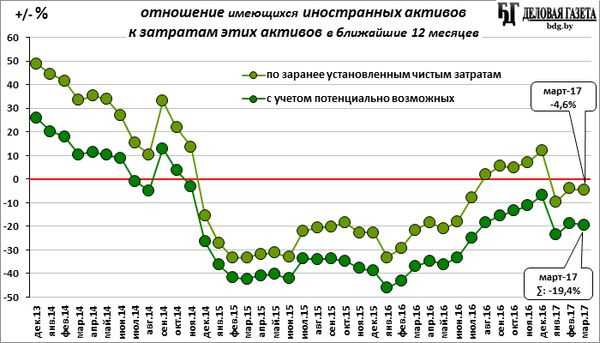 За март недостаточность валютных активов Нацбанка усилилась: объем имеющейся в наличии международных активов сократился в марте на бОльшую величину, чем снизилась сумма предстоящих в течение ближайших 12-и месяцев выплат по государственным валютным долгам.