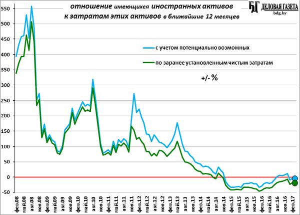 Превышение всех, с учетом возможных, затрат активов над суммой самих активов впервые появилось в 2014-м году. Раньше активов было в разы больше, чем предстоящих их чистых затрат: выплат по займам, ценным бумагам и прочим обязательствам в иностранной валюте тогда был небольшой, ведь значительных долгов страна тогда еще не набрала.
