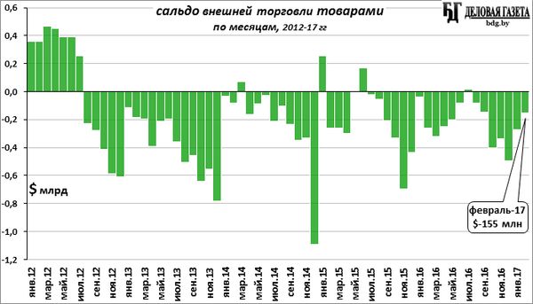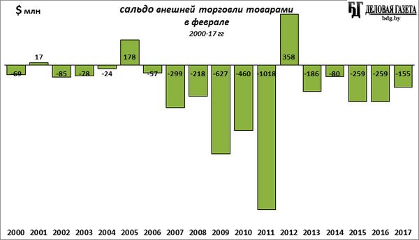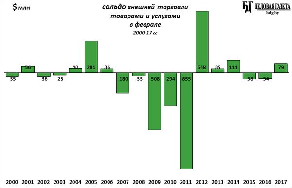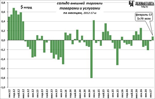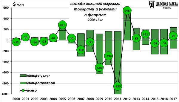 Общее сальдо внешней торговли товарами и услугами в феврале улучшилось с января на $102 млн (сальдо товаров стало лучше на $119 млн, сальдо услуг, наоборот, хуже, но только на $17 млн), став, в итоге, плюсовым, когда как в январе был «минус». Февральский «плюс» в $79 млн сложился из товарного «минуса» в $155 млн и «плюса» по услугам в $234 млн.