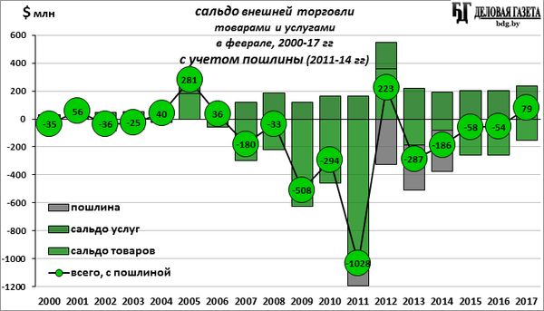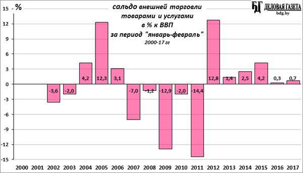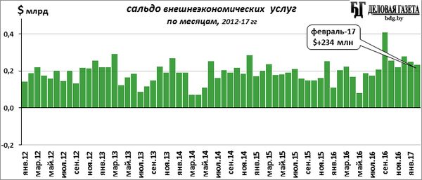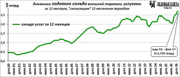 Годовое сальдо внешней торговли товарами и услугами в отчетном 12-месячном периоде (март 2016-го - февраль 2017-го) $-19 млн, сложившись из большого годового товарного «минуса» ($-2,724 млрд) и чуть меньшего годового «плюса» по услугам ($+2,705 млрд – новый исторический максимум). Годовое минусовое сальдо – всего лишь 0,04% от ВВП.