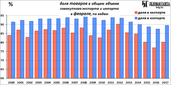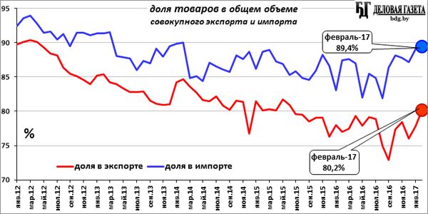 Доля экспорта товаров в совокупном экспорте (товаров и услуг) из Беларуси составила в январе-феврале 2017-го 79,1%, снизившись с января-февраля 2016-го на 6,2 п.п. (тогда было 85,3%) благодаря большему росту экспорта товаров в денежном выражении, чем экспорта услуг. Доля товарного импорта в общем объеме импорта в Беларусь в январе-феврале – 89,2%, за год он вырос на 3,9 п.п. (было 85,3%): импорт товаров вырос, услуг – упал.