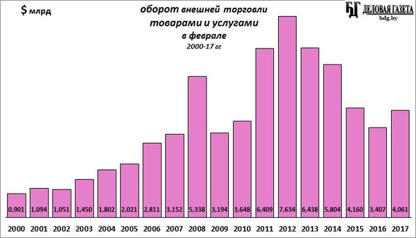 Внешнеторговый товарооборот за период “март-2016-го – февраль 2017-го” - $49,907 млрд. Исторически рекордный - $93,122 млрд («сентябрь-11 – август-12»). Минимум последних лет - $48,410 млрд («декабрь-15 – ноябрь-16»), минимум в кризис 2009-го - $46,925 млрд («ноябрь-08 – октябрь-09»).