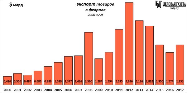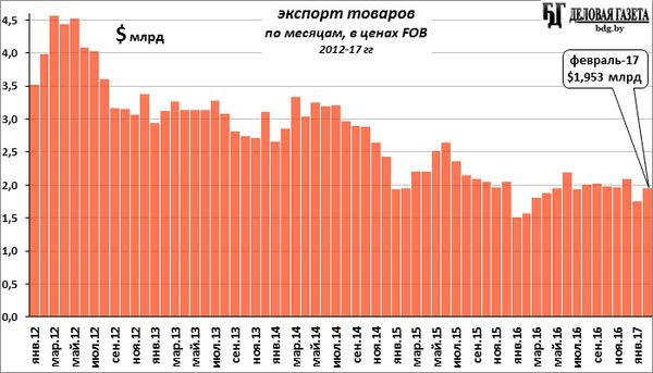 В сравнении с февралем 2016-го, экспорт товаров в феврале 2017-го больше, в денежном выражении, на $379 млн (+24,1%). Превышен, немного, даже февраль 2015-го.