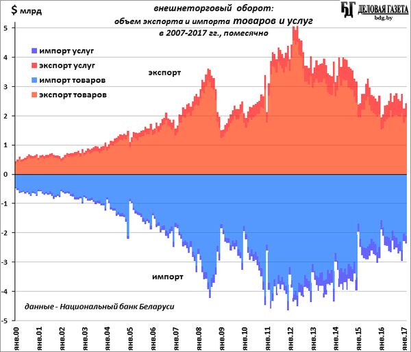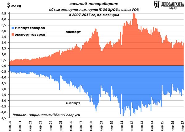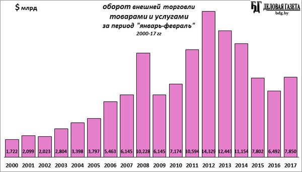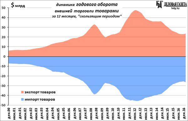 Максимальный внешнеторговый оборот был в 2012-м (рекордный - $9,605 млрд в мае того года). Минимум последнего времени был в январе 2016-го ($3,845 млрд). Для сравнения, «дно» кризисного 2009-го - $3,349 млрд (также в январе).