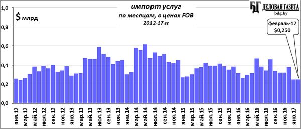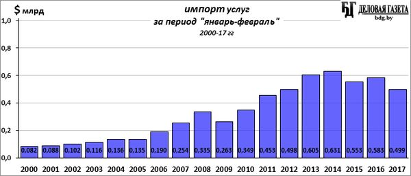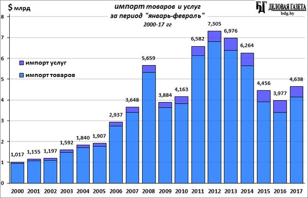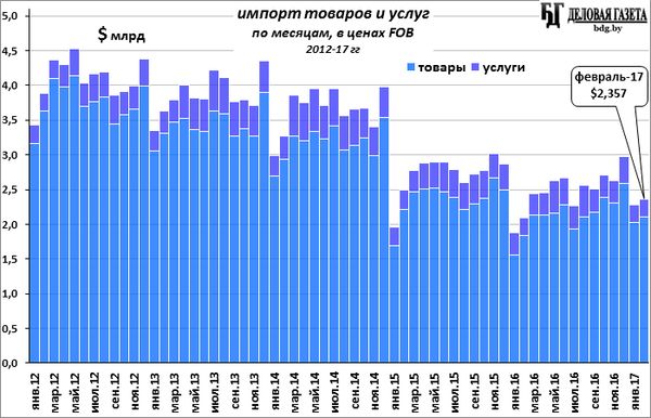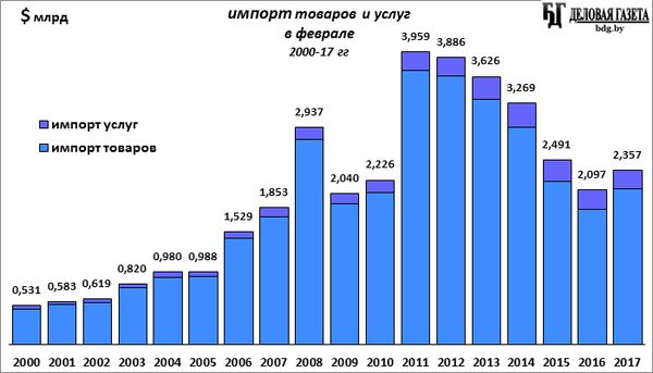 Импорт товаров и услуг в январе-феврале 2017-го больше, чем в январе-феврале 2016-го, на $661 млн (+16,6%): эта сумма сложилась из роста импорта товаров на $745 млн, при падении импорта услуг на $84 млн. Общий импорт первых 2-х месяцев 2017-го превысил уровеь соответствующего периода 2015-го.