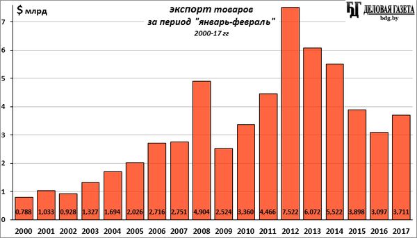 Максимальный объем внешней торговли товарами был в 2012-м (рекордный: в марте - $8,677 млрд, в мае - $8,675 млрд) – благодаря резкому увеличению оборота в нефтяном секторе в связи с действием в I полугодии определенных схем при экспорте нефтепродуктов из Беларуси, которые позволяли реэкспортировать российские нефтепродукты.