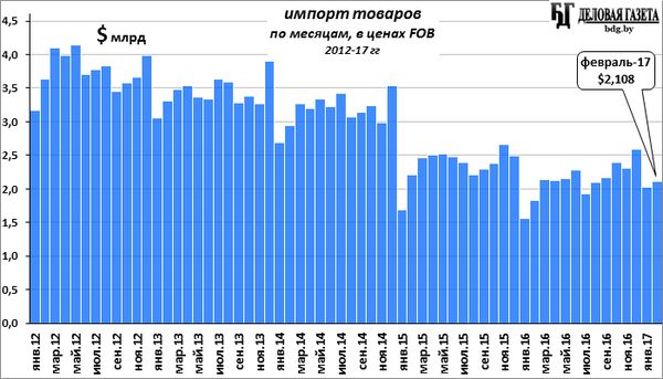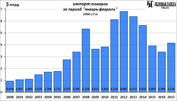 Импорт в январе-феврале 2017-го больше, чем в январе-феврале 2016-го, на $745 млн (+21,9%). Кроме того, превышен уровень 2015-го.