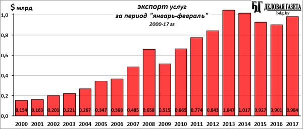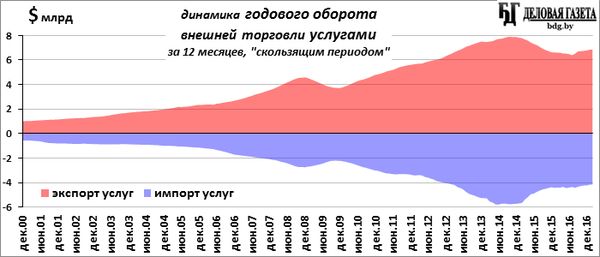 Оборот внешнеэкономических услуг за период “март-2016-го – февраль 2017-го” - $11,016 млрд. Исторически рекордный - $13,668 млрд («ноябрь-13 – октябрь-14»). Недавний минимум - $10,753 млрд («август-15 – июль-16»)..