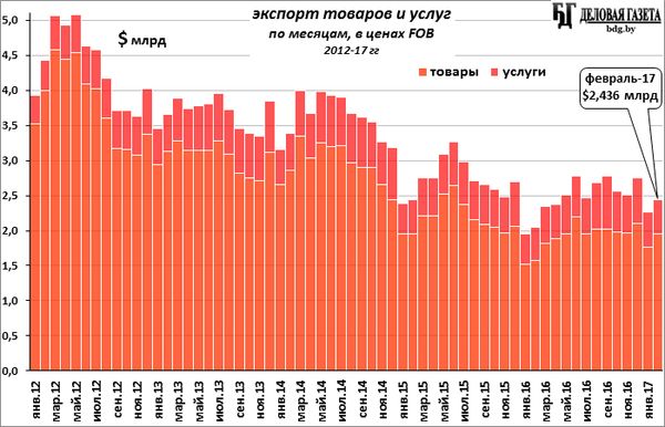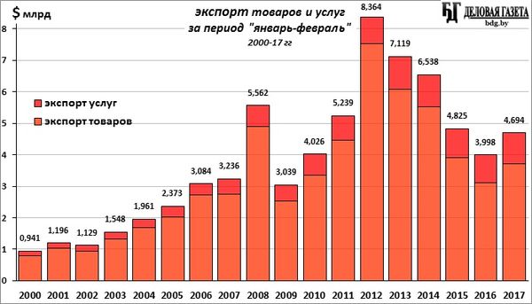 Экспорт товаров и услуг в январе-феврале 2017-го больше, чем в январе-феврале 2016-го, на $696 млн (+17,4%): товаров - на $613 млн, услуг – на $83 млн.