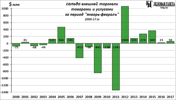 Совокупно по товарам и услугам сальдо внешней торговли января-февраля 2017-го улучшилось на $35 млн: экспорт товаров и услуг вырос на $696 млн, импорт – на $669 млн (на $35 млн меньше).