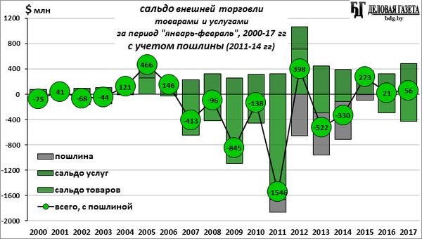 В 2011-14 гг. действовали обязательства Беларуси по переводу в Российскую Федерацию пошлины при экспорте нефтепродуктов за пределы Таможенного Союза (что не учитывалось как экспортно-импортная операция и отмечалось в других строках платежного баланса), когда как сейчас пошлина полностью поступает в бюджет Беларуси. С учетом этого сегодняшний результат внешней торговли выглядит куда лучше, чем в те годы.
