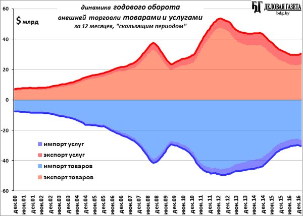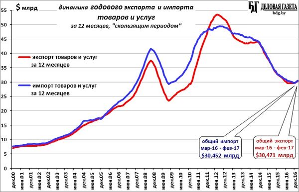 За год (за последние 12 месяцев) внешнеторговый оборот товаров и услуг Беларуси в денежном выражении составил в отчетном периоде («март 2016-го - февраль 2017-го») $60,923 млрд.