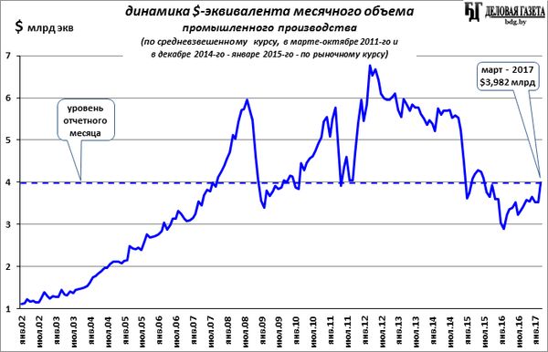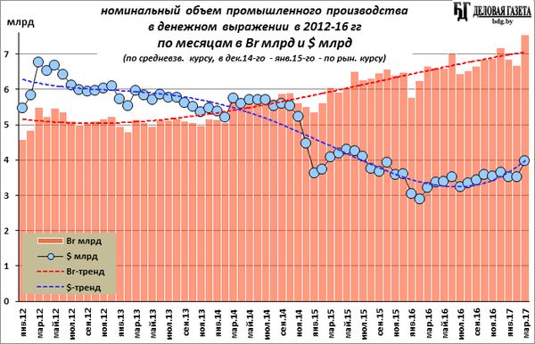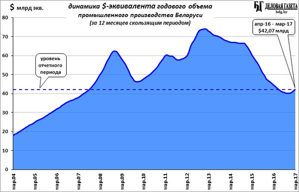 Рекодное же значение $-эквивалента годового объема промпроизводства Беларуси остается прежним и недосягаемым - $74 млрд в 2012-м. $-эквивалент календарного 2016-го - $40,2 млрд, 2015-го - $46,8 млрд, 2014-го - $65,4 млрд, 2013-го - $68,1 млрд, 2009-го - $46,2 млрд, 2008-го - $62,1 млрд.