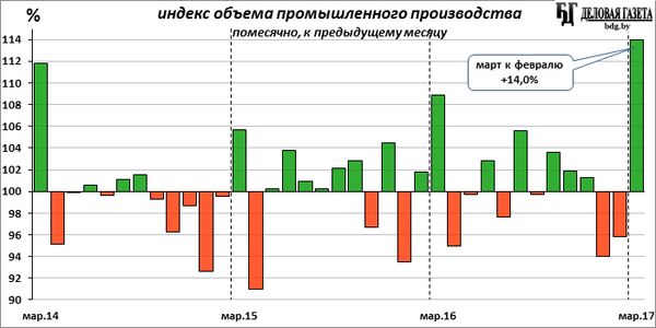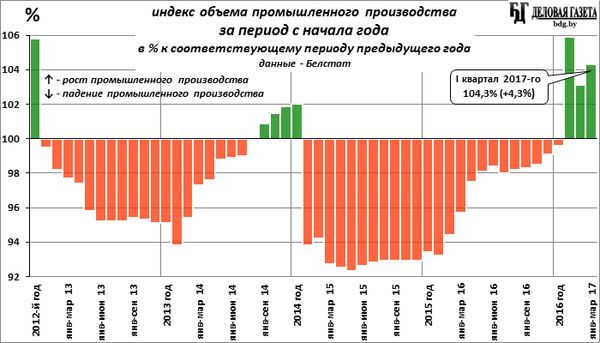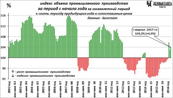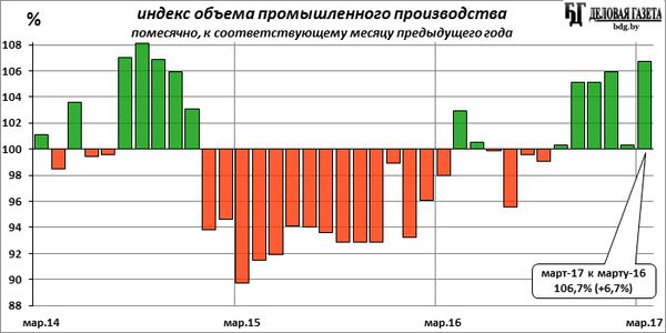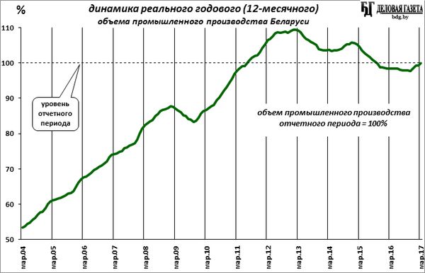 Два месяца назад промышленность Беларуси вышла из красной зоны”: завершился самый длительный (20-месячный) с 90-х период минусовых годовых индексов объема промышленного производства. А в отчетном 12-месячном периоде «апрель 2016-го - март 2017-го» плюсовое значение годового индекса увеличилось: объем промпроизводства вырос к соответствующему периоду год назад на 1,6% в сопоставимых ценах.