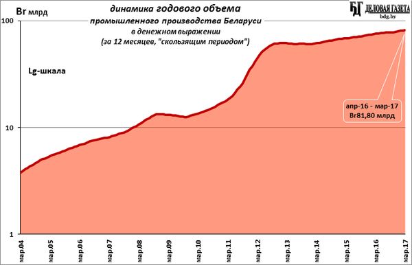 За год (за последние 12 месяцев, “апрель 2016-го - март 2017-го”) предприятия промышленности Беларуси выпустили товаров и услуг на Br81,80 млрд.