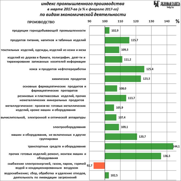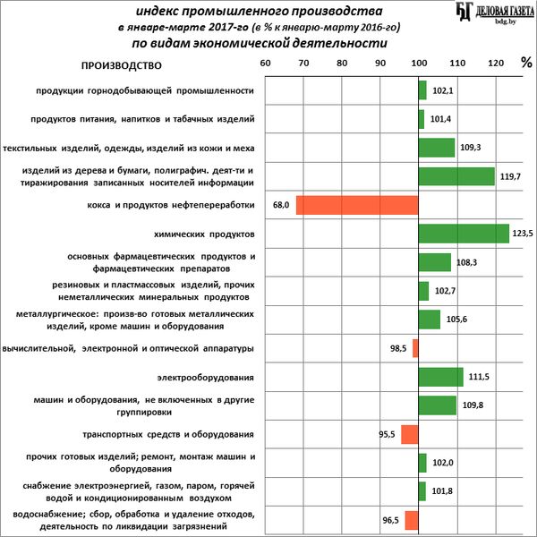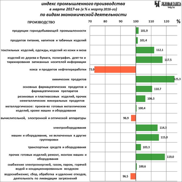 В абсолютном большинстве секторов промышленности в I квартале 2017-го выпуск продукции и услуг вырос (в сравнении с соответствующим периодом 2016-го в сопоставимых ценах), особенно в производстве химических продуктов (прежде всего – калийных удобрений) и производстве изделий из дерева и бумаги.