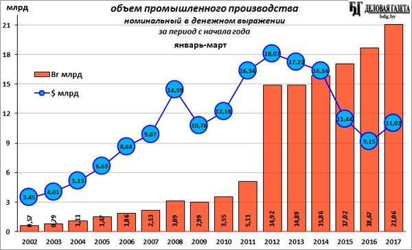 Долларовый эквивалент объема промышленного производства тоже вырос: к соответствующему периоду прошлого года (чему способствовало, кроме физического прироста, укрепление Br-рубля к доллару и рост мировых цен, прежде всего на нефтепродукты), к предыдущему месяцу и в годовом исчислении: в отчетном 12-месячном периоде он поднялся до $42,07 млрд (по итогам календарного 2016-го было чуть больше $40 млрд). Хотя это всего лишь уровень 2007-го.