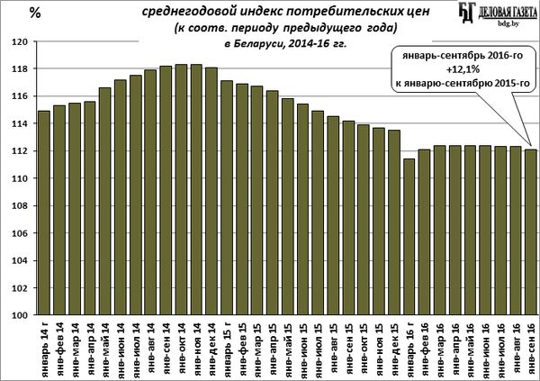Прогнозный показатель годового ИПЦ в Беларуси на 2016-й год – 112%. На 2017-й – 109%.