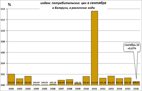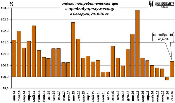 В сентябре потребительские цены выросли, в целом, на 0,67%: индекс потребительских цен (ИПЦ) составил 100,67% (данные Белстата). Это первый всплеск потребительской инфляции после 6-месячного периода ее ежемесячного замедления, закончившегося первой за 7 лет месячной дефляцией в прошлом месяце.