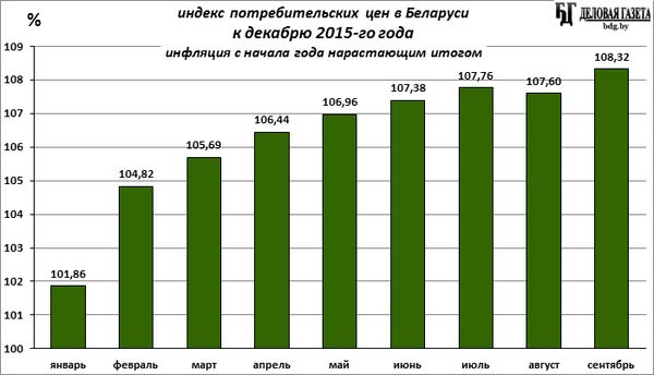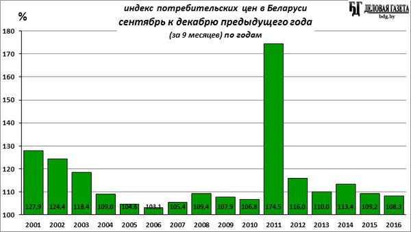 С начала 2016-го года, за 9 месяцев, цены на потребительские товары и услуги в Беларуси выросли на 8,32%. Из них на продовольственные товары – на 5,9% (с алкоголем и табаком – на 6,0%), на непродовольственные – на 7,0%, а на услуги – на 16,3%.