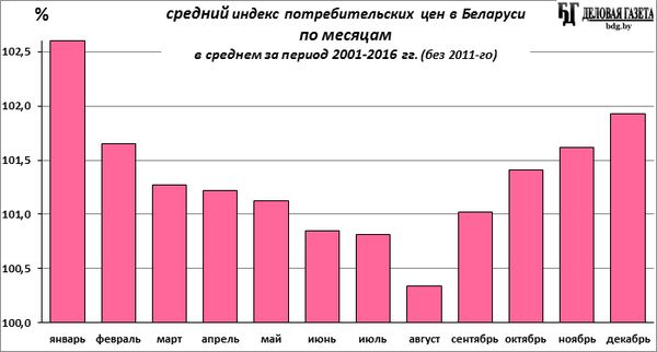 Ускорение инфляции в этот период - обычное для Беларуси (и не только) явление, связанное с сезонными факторами. Это видно на диаграмме, где представлены средние значения месячных индексов цен на товары и услуги потребительского сектора за последние 15 лет (без 2011-го, когда динамика ИПЦ была обусловлена сильнейшей девальвацией Br-рубля в тот год).
